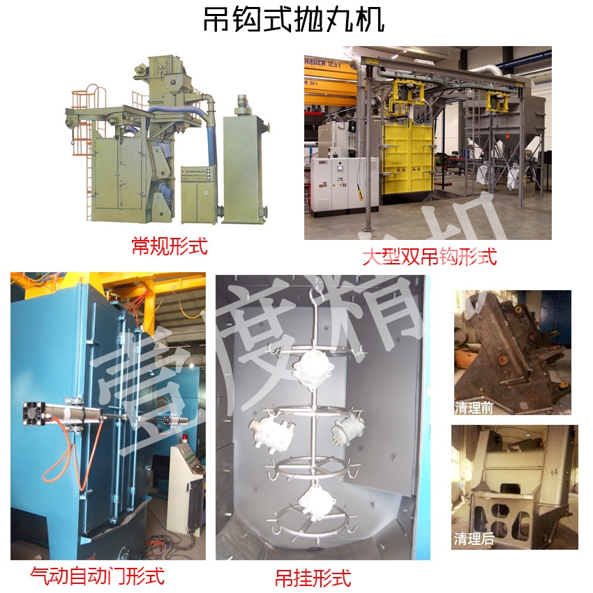 注:本機適用鋼砂、鋼丸或鋅丸等金屬磨料,拋丸器可變頻調(diào)速,吊具可設計成固定在機艙內(nèi),也可以設計成自動進出形式,工件自轉(zhuǎn)速度可變頻調(diào)整,門可自動開啟也可以做成手動開啟,裝卸工件處可加裝安全光幕,讓操作更安全可靠,也可根據(jù)需要定制其它輔助使用裝置。以上機型為我公司標準化設計,如果客戶需要其他形式,可根據(jù)客戶工件大小及工藝需求規(guī)劃設計,隨時歡迎來電咨詢,我們將竭誠為您服務。